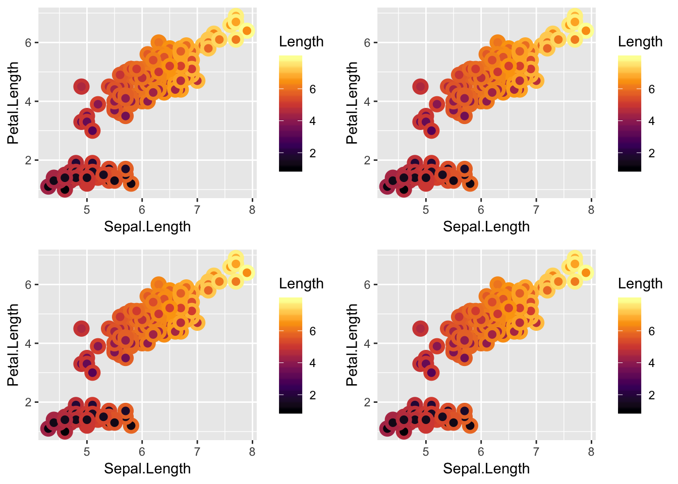 Aesthetics containing the word “color” are now always standardized internally to read “colour”. This happens transparently to the end user, so that the British and American spellings of “colour” / “color” are fully equivalent throughout the entire ggplot2 code base. Therefore, the following four examples all produce the same plot.