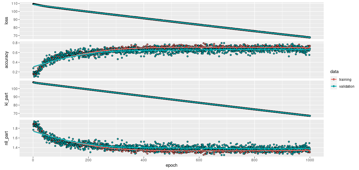 While the overall loss declines linearly (and probably would for many more epochs), this is not the case for classification accuracy or the NLL part of the loss:
