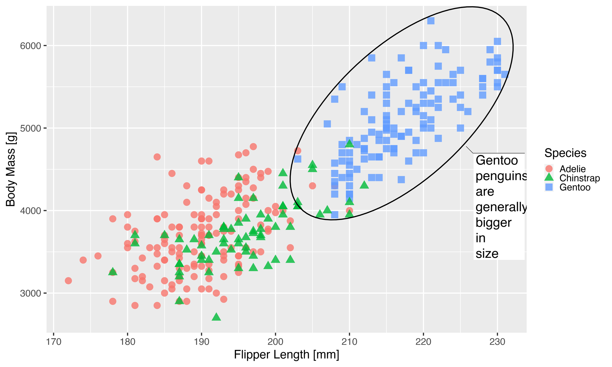 labs(x = "Flipper Length [mm]", y = "Body Mass [g]",  colour = "Species",