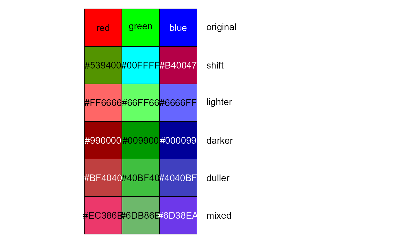 Having palettes as a class rather than as plain functions, allows us to store useful metadata about the palette which can be used downstream. In addition, most colour palette functions also allow the aforementioned colour manipulation functions to work on the palette output.