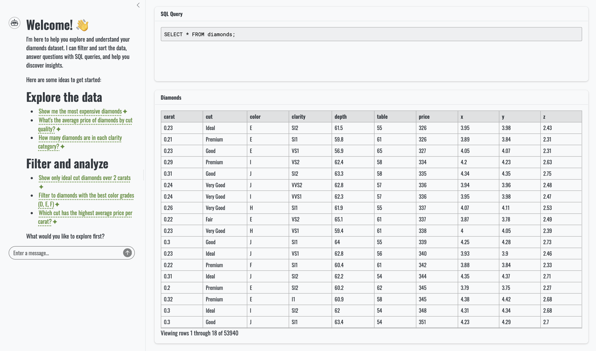 Things get more interesting when we introduce a calculation. Asking “can you show the 20 biggest diamonds, based on volume?” still results in simple SQL, but the output now includes an extra column, volume, which appears neatly in the app.