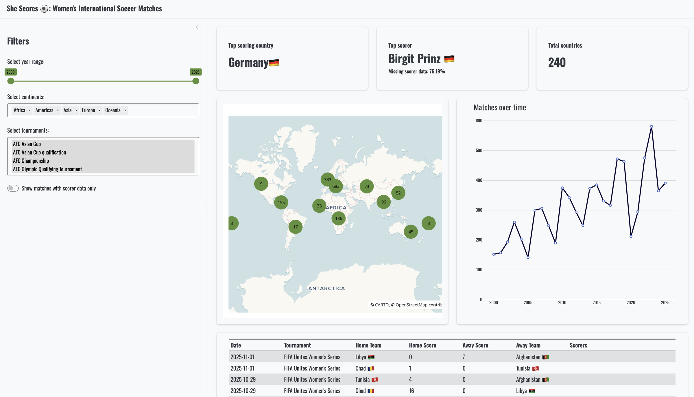 • SheScores, the soccer dashboard that you were so proud of earlier. This app originates from the shiny::conf(2024) workshop  “Shiny 101: The Modular App Blueprint” , although it has been tweaked to make it a bit more interesting and updated with matches through to November 2025.